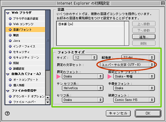 IEの「編集」>「初期設定」>「Webブラウザ」>「言語/フォント」で以下の画面になりますが←クリックで拡大